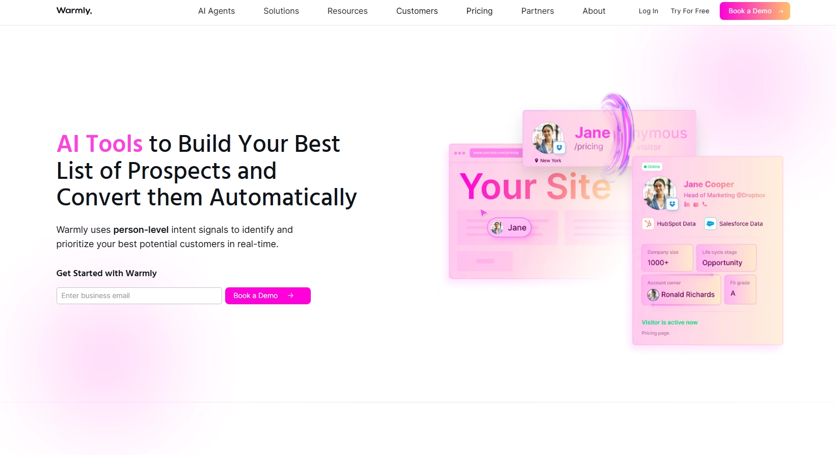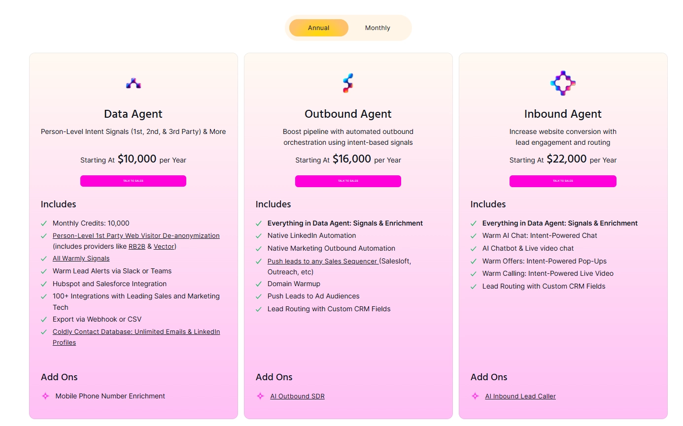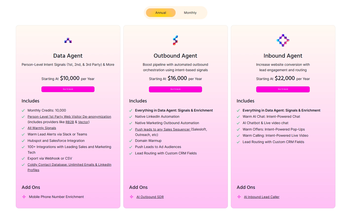 Warmly | Signal-based revenue orchestration: website visitor de-anonymization, intent signals, automated outreach, AI chat, and live lead engagement. | AI Data Agent: from $10,000/yr; AI Inbound Agent: from $16,000/yr; AI Outbound Agent: from $22,000/yr. |