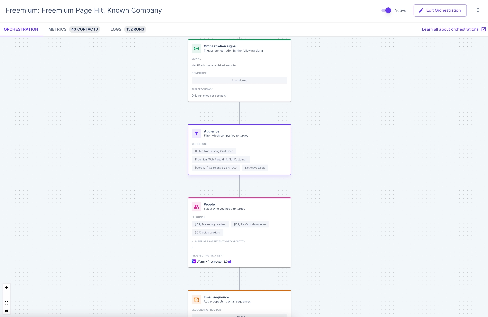 4. Use Warmly’s Orchestrator to automatically add leads matching specified criteria (they visited a specific page, downloaded your whitepaper, etc.) to email and/or LinkedIn sequences to nurture and guide them further down the funnel.