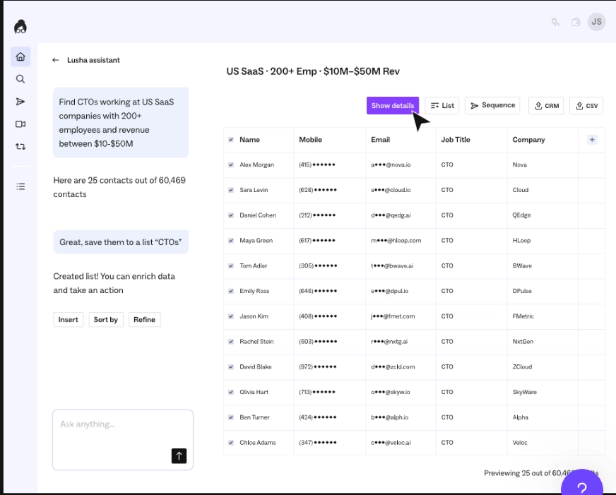 You’ll see full contact details like name, title, email, LinkedIn profile, phone number, and more, enriched with firmographic and technographic data.