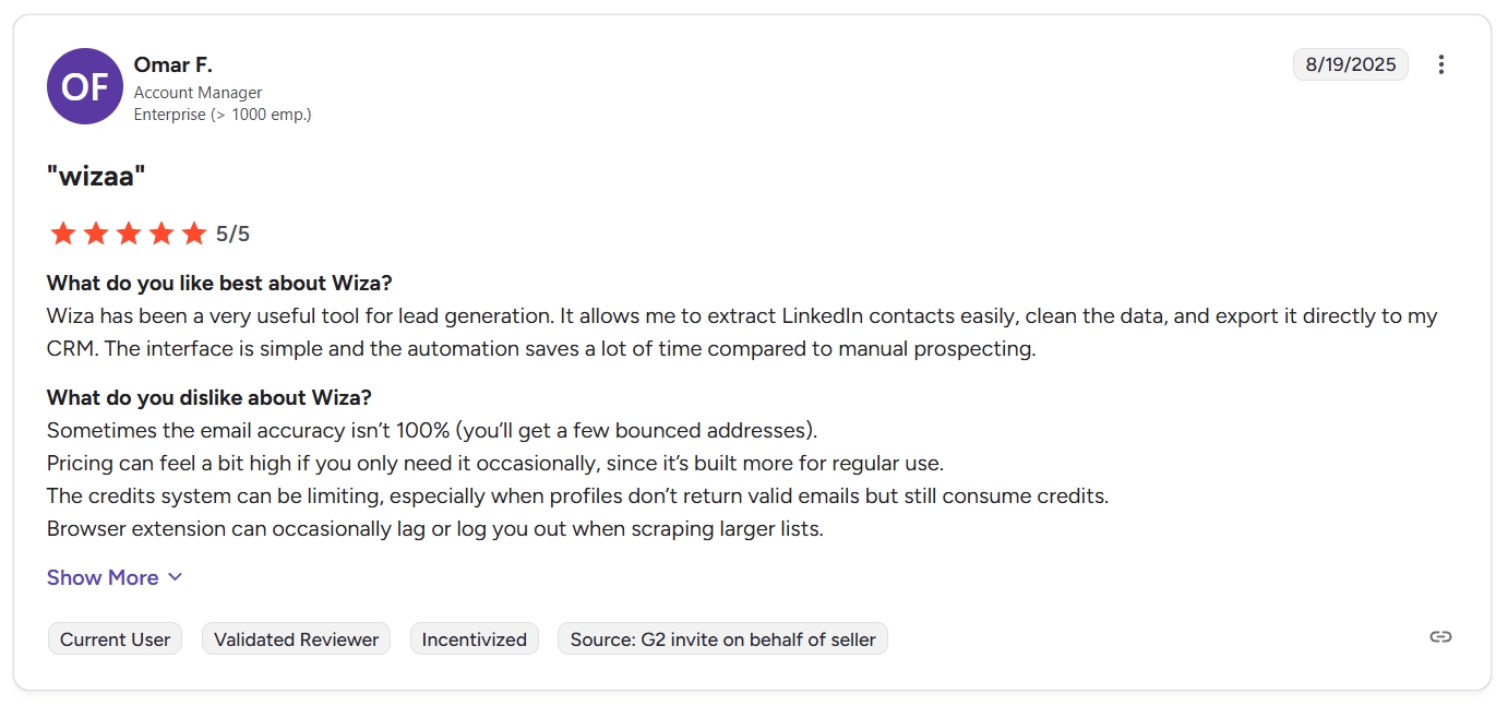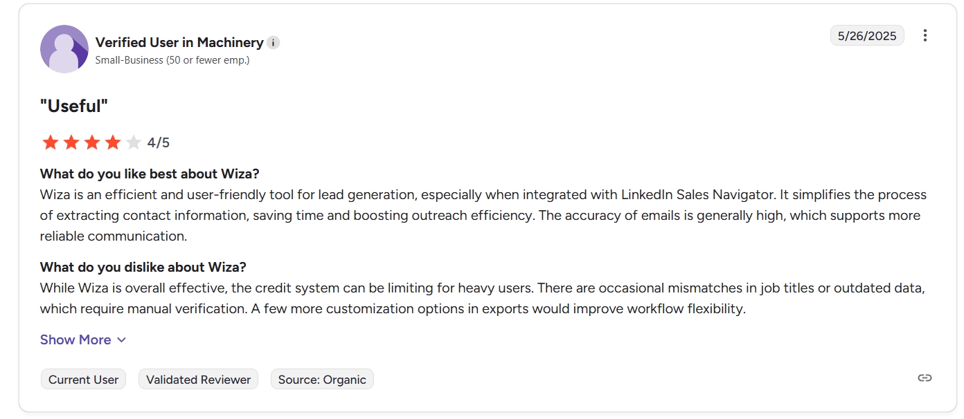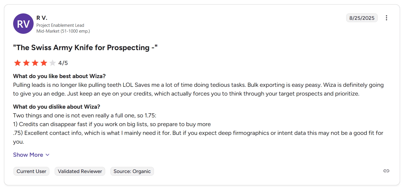 On G2, users flag “inaccurate data,” outdated contacts, and occasionally guessed or risky emails.