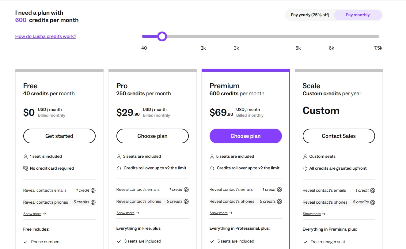 Lusha | Offers verified emails and direct dials via a Chrome extension and API, optimized for simplicity, speed, and compliance in core markets. | Free plan (40 credits); Paid plans start at $29.90/month (Pro), $69.90/month (Premium); Scale plan custom. |