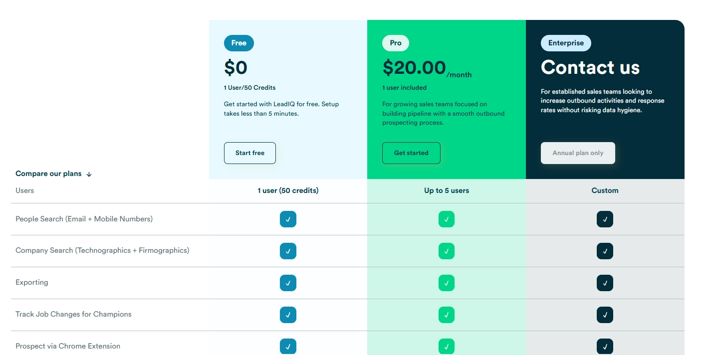 LeadIQ | Designed for SDRs working in LinkedIn, it captures leads from profiles in real time and syncs them directly to your CRM and sequences. | Free plan (50 credits); Pro plan from $20/user/month; Enterprise plan custom. |