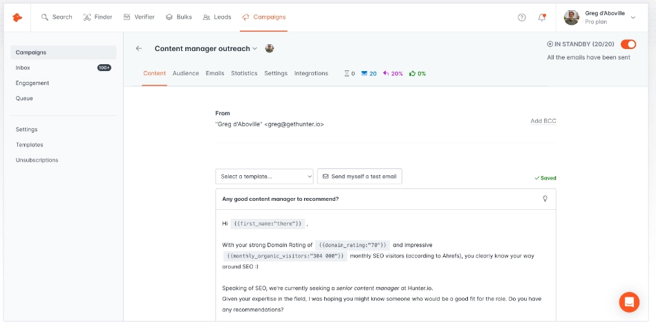 - Drip campaigns: Build multi-step email sequences with follow-ups, A/B testing, and personalization.