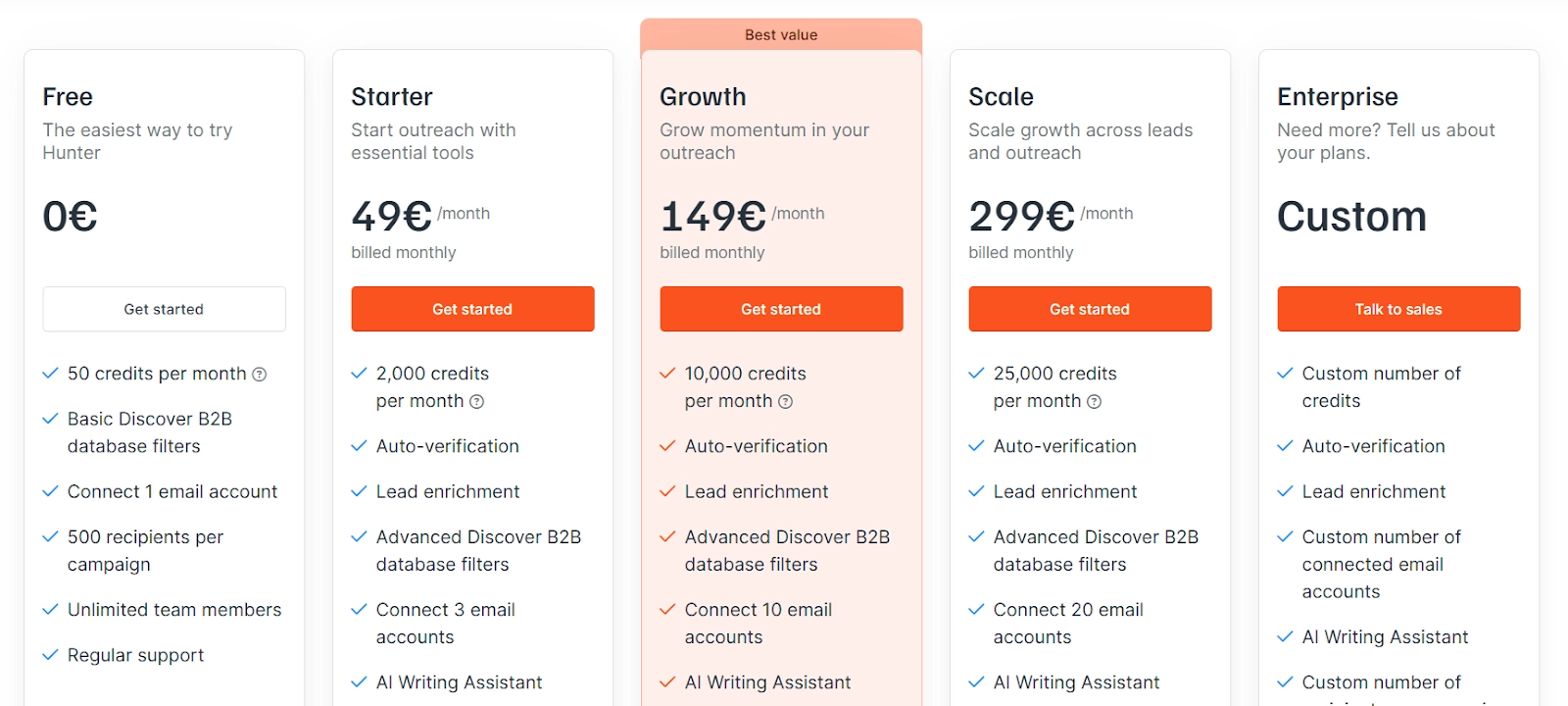- Growth: €149/month, includes 10,000 credits/month, everything in Starter, 10 email accounts, up to 5,000 recipients per campaign.