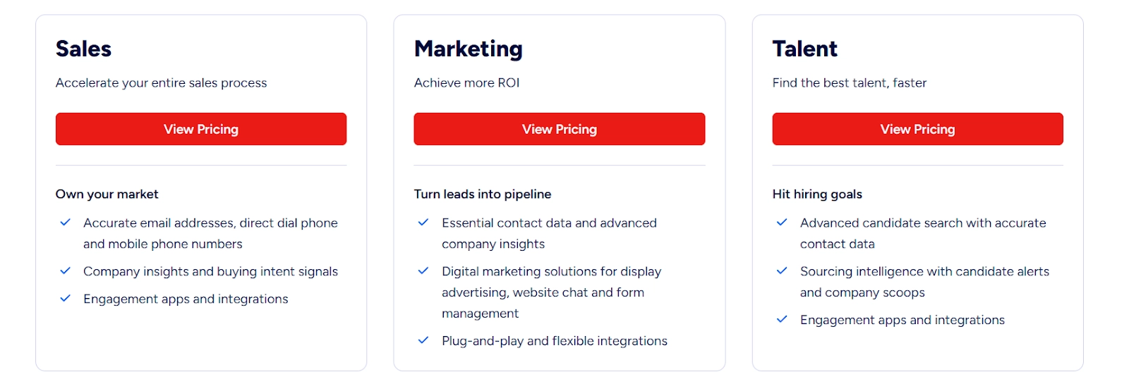Cognism | Focused on compliant, high-accuracy data (especially in EMEA) and enriched with phone numbers and intent data for regulated markets. | Custom pricing (Platinum and Diamond tiers). |