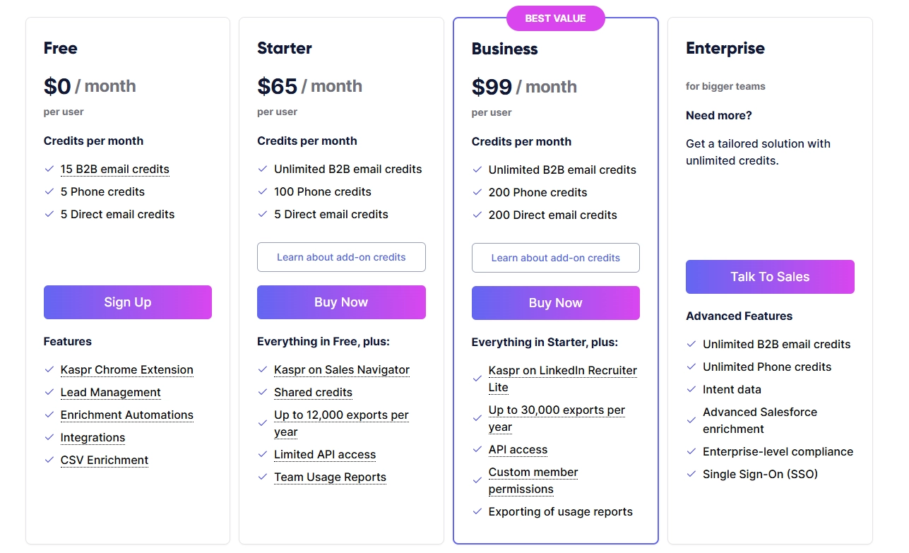 - Enterprise: Custom pricing, includes unlimited B2B email & phone credits, intent data, advanced Salesforce enrichment, SSO, enterprise compliance, and unlimited exports.