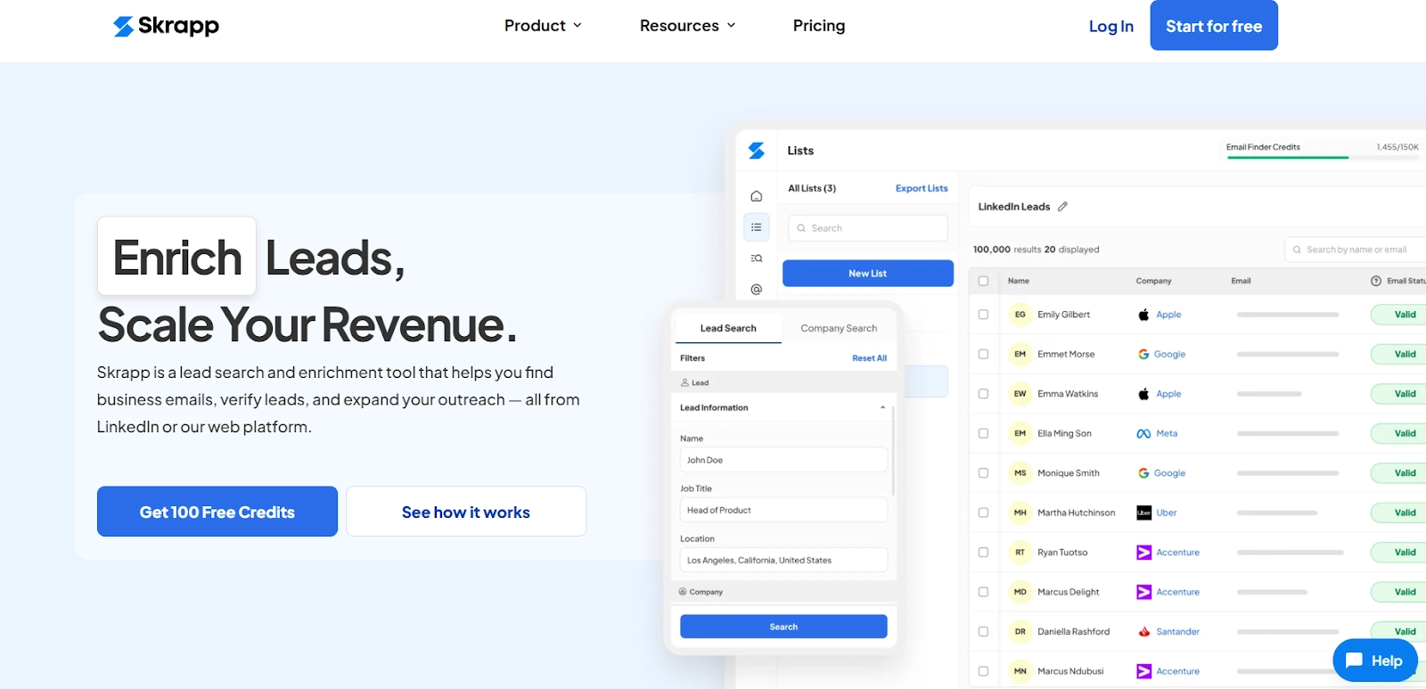- Free: Includes 1 user, 100 email credits/month, email finder & verifier, Chrome extensions for LinkedIn, Sales Navigator, Recruiter, and website email discovery, limited leads and company search.