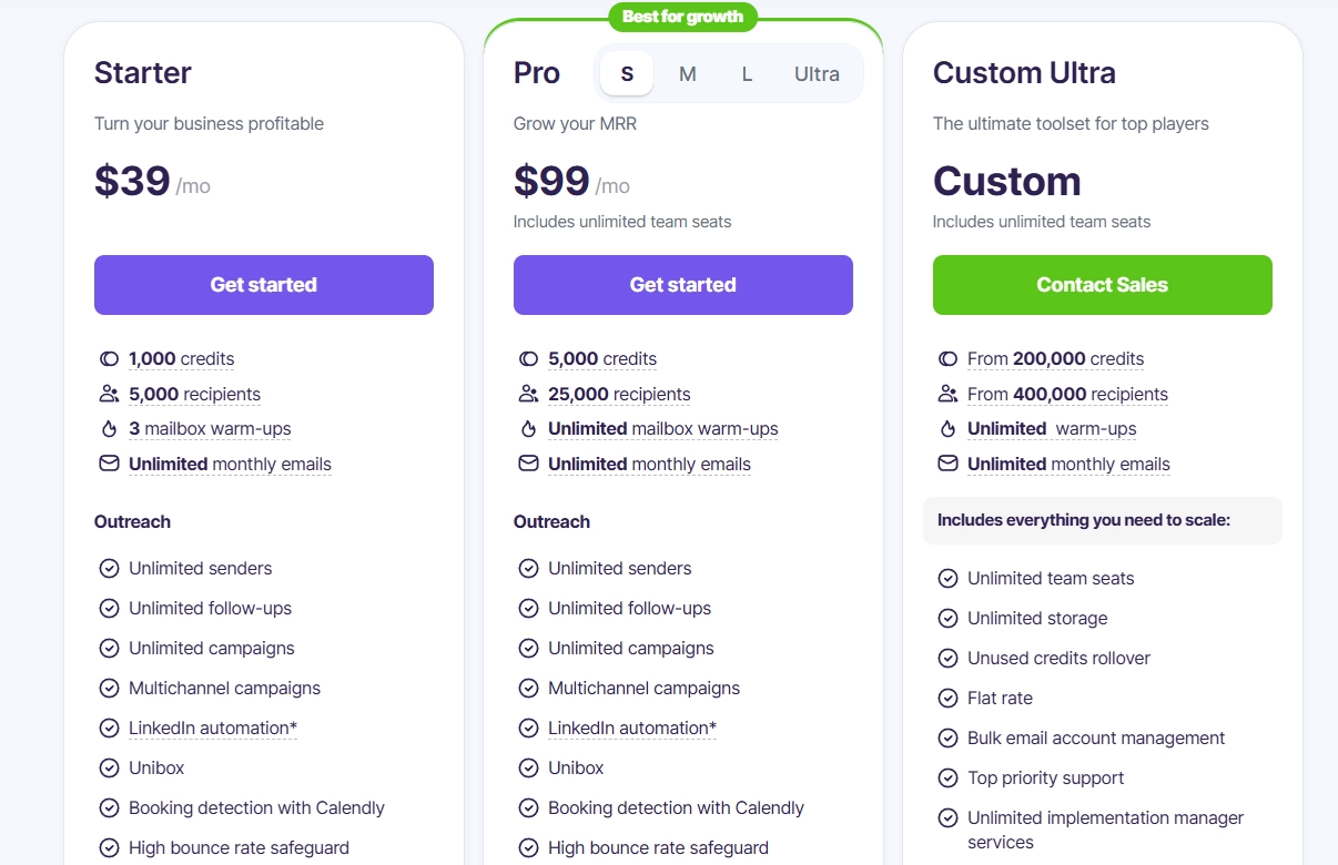 - Custom Ultra: Custom pricing, starting from 200,000 credits & 400,000 recipients, unlimited warm-ups, monthly emails, storage, and team seats, bulk email account management, etc.