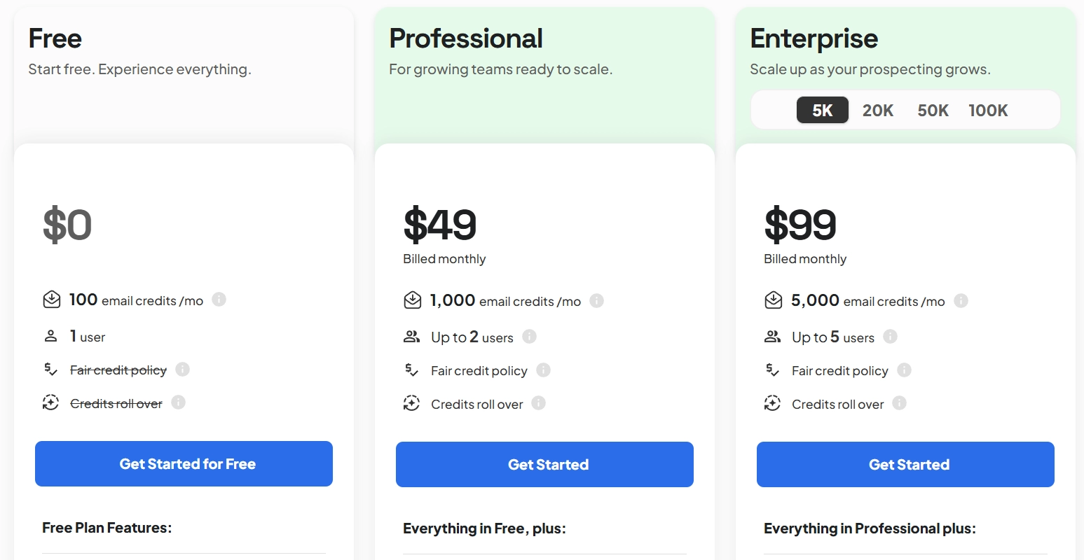 - Enterprise: Custom pricing, includes tailored credits, inbox connections, and campaign limits, auto-verification, enrichment, and advanced filters.