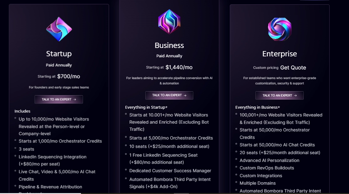 - Custom Pricing: Custom traffic volume with up to 60% deanonymized traffic. Includes everything in Account Reveal plus advanced customization options.