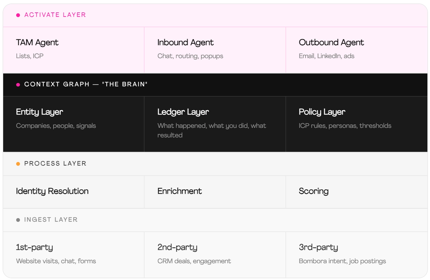 This is where raw signals become actionable intelligence. Identity resolution matches anonymous website visitors to known contacts and companies. The activity ledger records every signal, action, and outcome in an immutable log. The unified timeline lets any agent query the full history of any account in under 5 seconds.