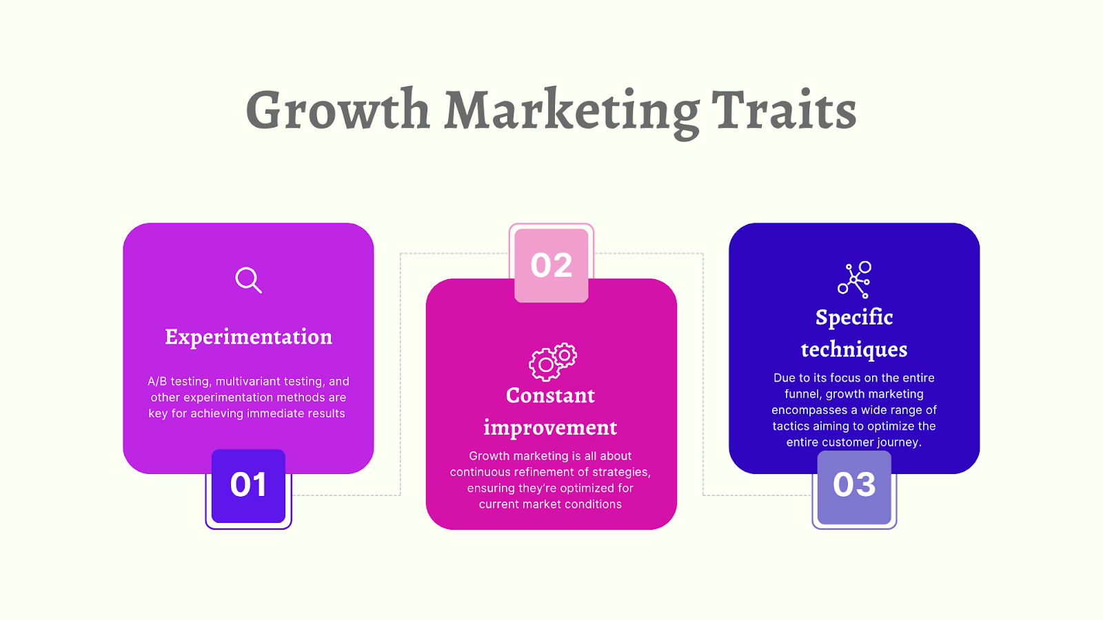 - Continuous improvement - Instead of focusing all their efforts on a single, large-scale campaign, growth marketing is more intent on deploying smaller-scale strategies, which they constantly test and refine over time.