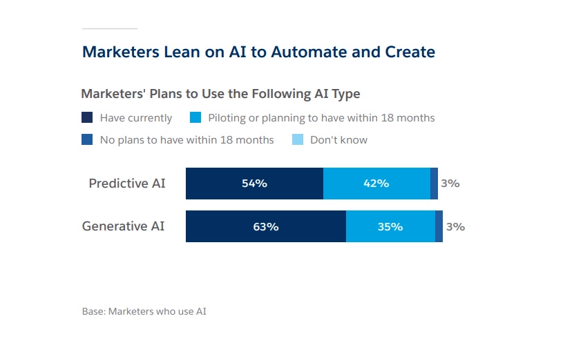 Conversely, predictive AI is used by 54% of marketers, while 42% are currently piloting it or intending to in the next 18 months.