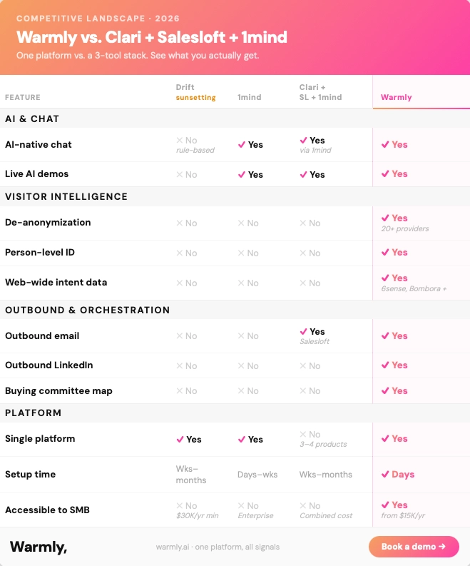 - Warmly - Best for mid-market and enterprise B2B with 400M+ profile context graph and buying committee tracking