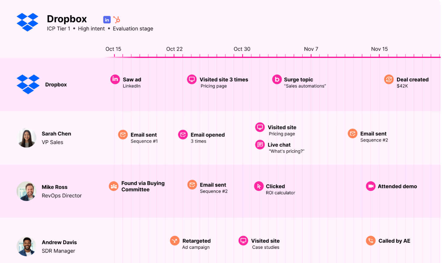 - Sees every signal across your entire GTM surface area