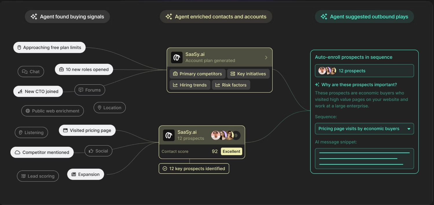 6sense collects intent signals from multiple sources (the platform claims it analyzes 500B+ intent signals monthly), such as website visits, keyword searches, and engagement patterns of prospects.