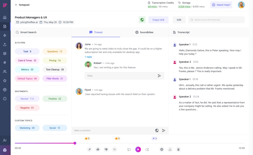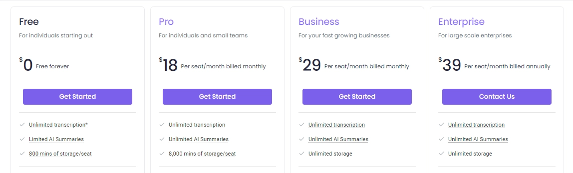 Fireflies.ai has a free forever plan with unlimited transcriptions, limited AI summaries, and 800 minutes of storage per seat, and access to some of its basic features.