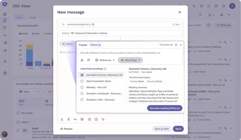 Instead of relying on manual reminders or hoping your reps remember who to follow up with, AI can automatically track lead behavior and re-engage at the right moment through personalized emails, LinkedIn messages, or even in-site chat prompts.